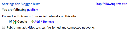 | There are a couple ways blogs show up on your "Manage Blogs I'm Following" page. Through Blogger you can follow a blog via the following gadget on the blog or you can add the blog directly to your Reading List. Blogs will also show up on your "Manage Blogs I'm Following" page if you've joined a site with Google Friend Connect. |