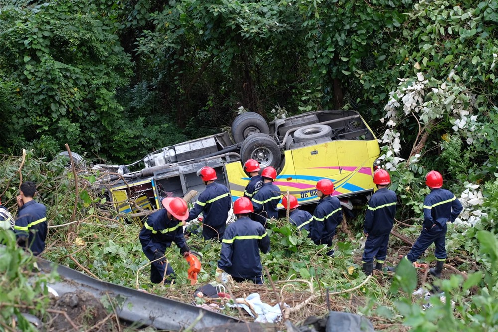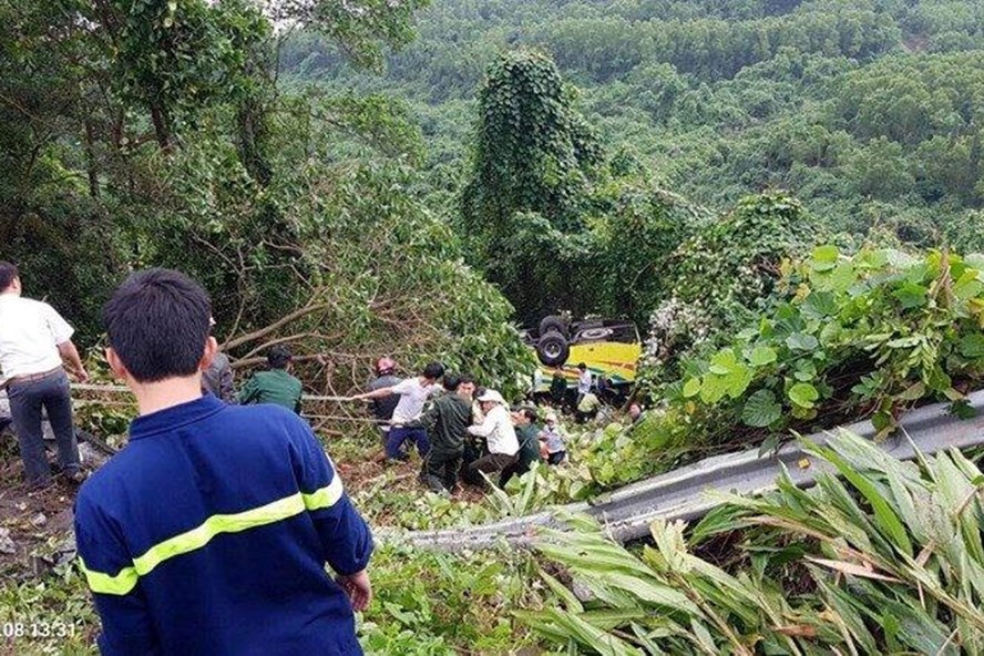 | Trưa 8.1.19, một chiếc xe khách chở 21 người đã bị rơi xuống bờ vực khi đang lưu thông trên đèo Hải Vân. |