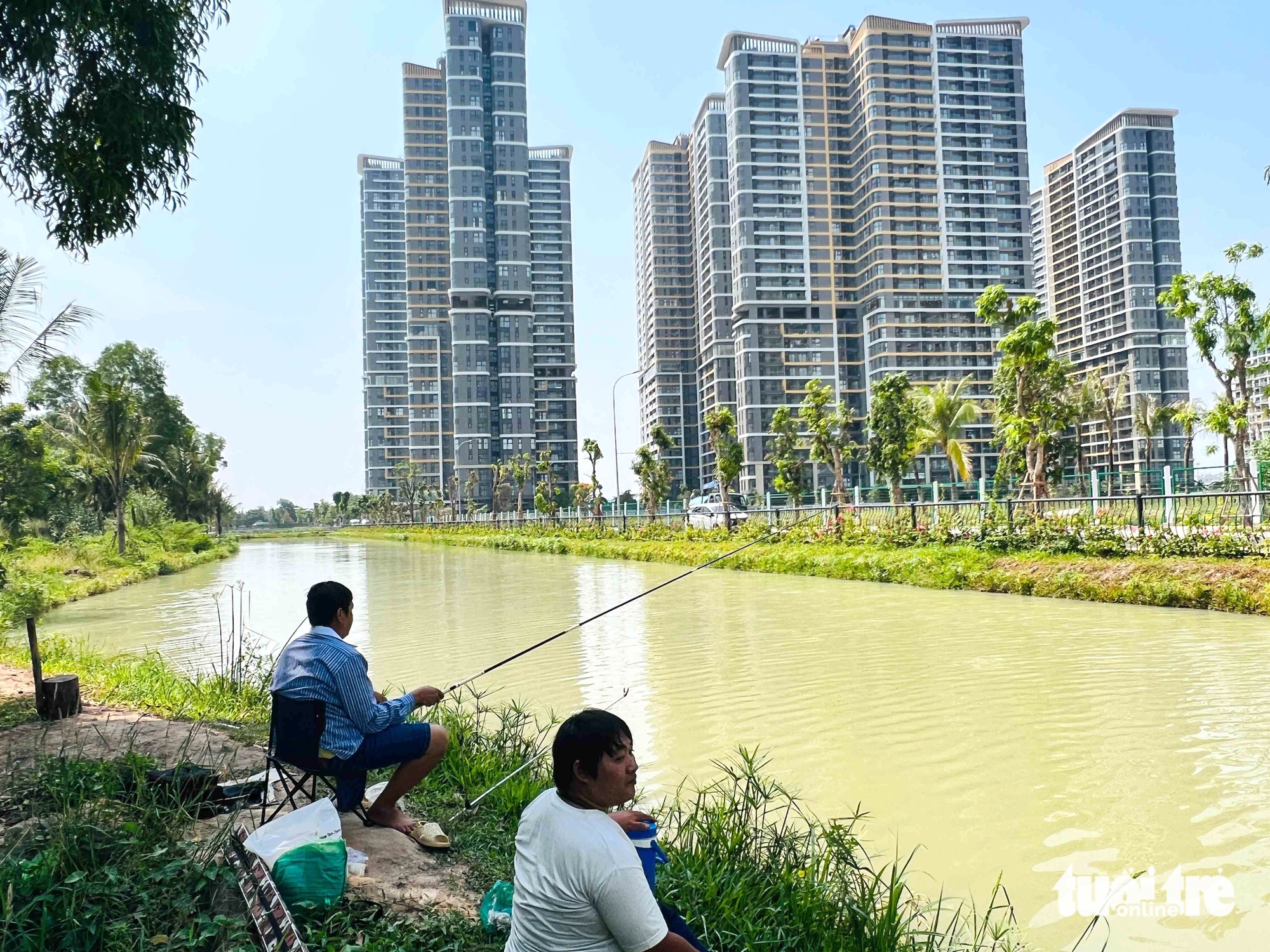 Người dân câu cá ở dòng kênh ven khu căn hộ mới khang trang phía đường Phước Thiện (TP Thủ Đức, TP.HCM) - Ảnh: YẾN TRINH