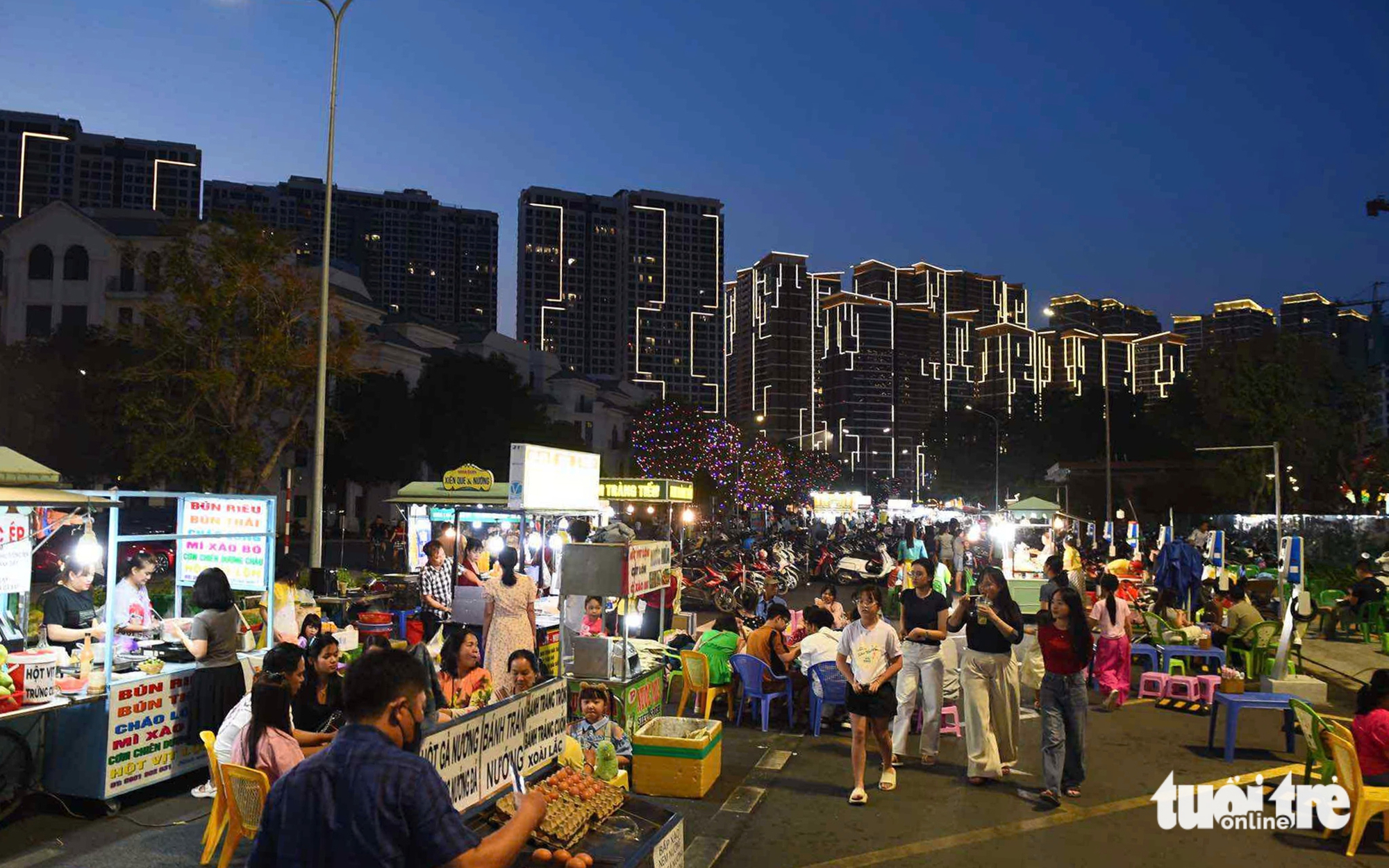 Phía góc trái, ngăn tách khu căn hộ và cuối đường Phước Thiện là dòng kênh nhỏ. Mấy anh chàng từ Bình Dương lên chơi, xách cần câu cá. Mé ngoài là mấy xe bún riêu, cơm tấm bình dân. Bà Tư (57 tuổi, quê Long An) bán khu này tám năm nay, ngày bán chừng 100 tô. "Ở đây được cái không phải thuê mặt bằng. Tôi thuê trọ gần đây 1,5 triệu đồng/tháng. Khu này tối nhộn nhịp đầy sức sống", bà nói.